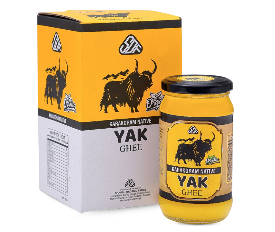 Yak ghee is a type of clarified butter made from the milk of yaks, which are resilient animals native to the Himalayan region & Gilgit Baltistan in Pakistan. The process of making ghee involves simmering butter to remove water and milk solids, resulting in pure butterfat. What makes yak ghee special is its unique nutritional profile. Compared to regular cow's ghee, it is reported to have higher levels of beneficial nutrients like phosphorus, calcium, and vitamins A, D, E, and K. It is also a rich source of healthy fats, including Omega-3, 6, and 9 fatty acids. Additionally, yaks graze on nutrient-dense grasses and herbs at high altitudes, which contributes to the quality of their milk and, consequently, the ghee.